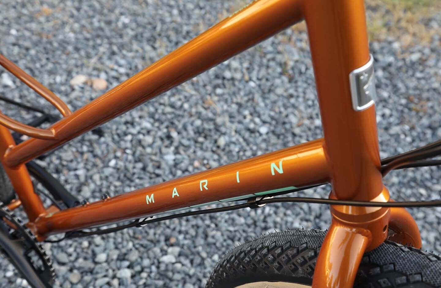 The Marin Larkspur has the initial appearance of an old school step through. But at the same time someone added chunky tan-wall tires, wide rims, powerful disk brakes and the option of a dropper seat post.